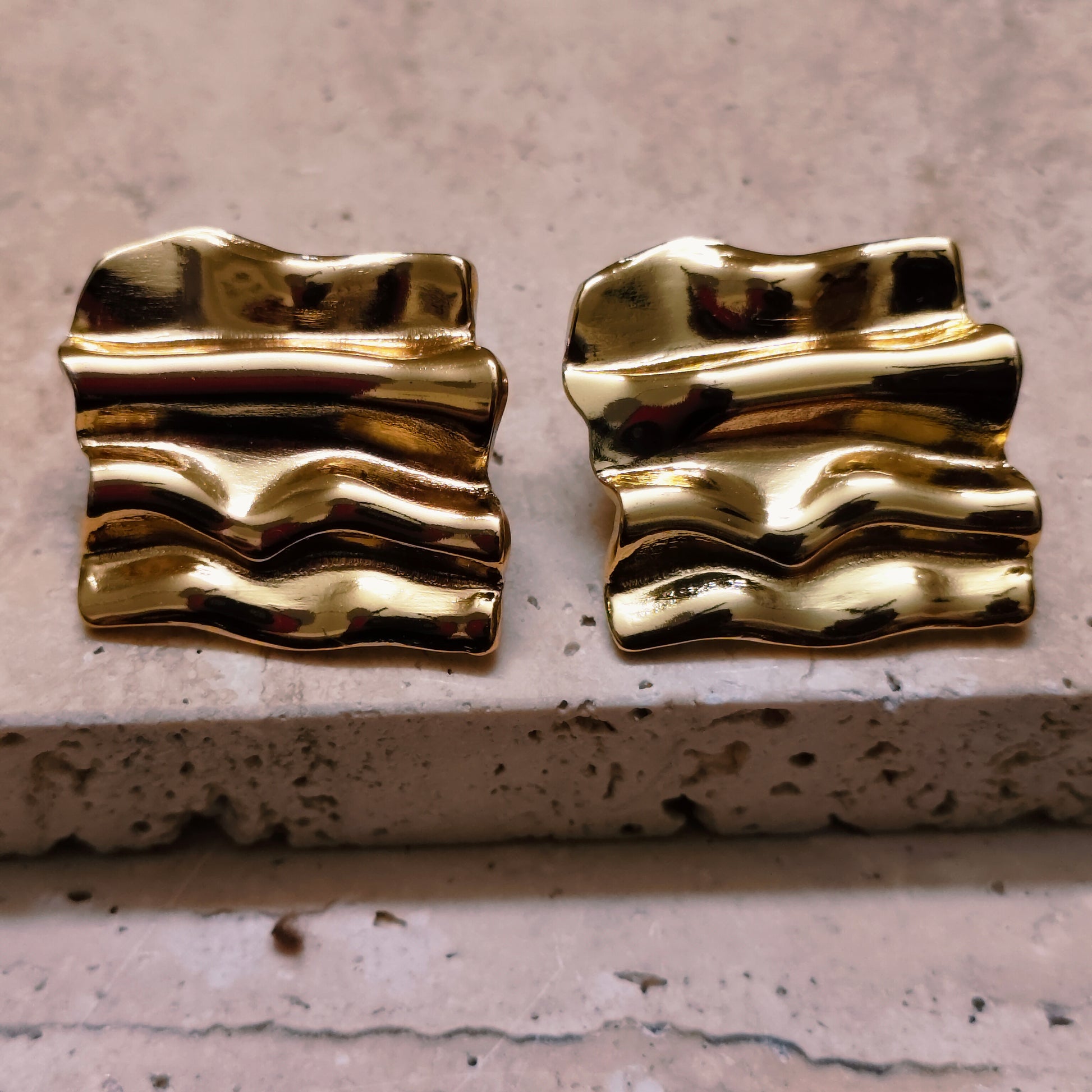 Inspired by the gentle rhythm of flowing gold, the Auric Wave Earrings embody effortless elegance. Their fluid, ripple-like texture catches light with every movement, reflecting both strength and softness. Finished in 18K gold plating, this sculptural design is a modern ode to timeless grace.