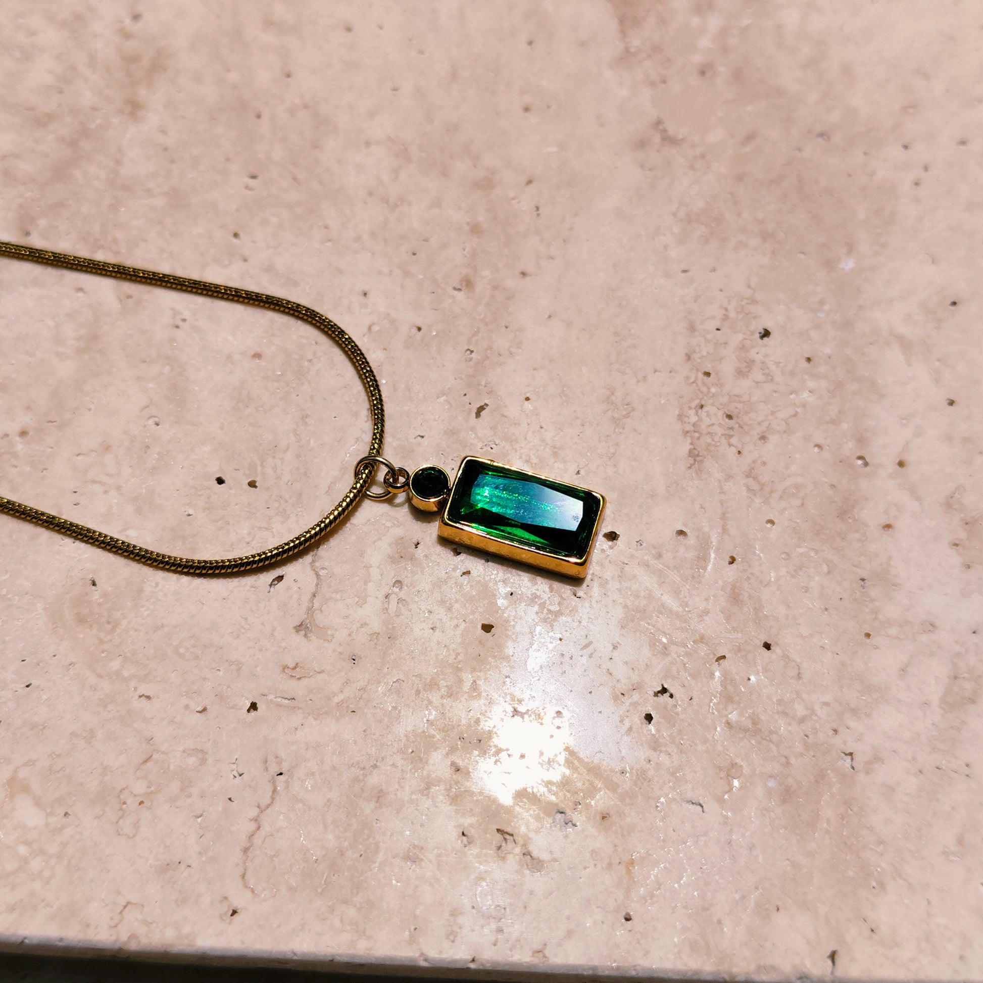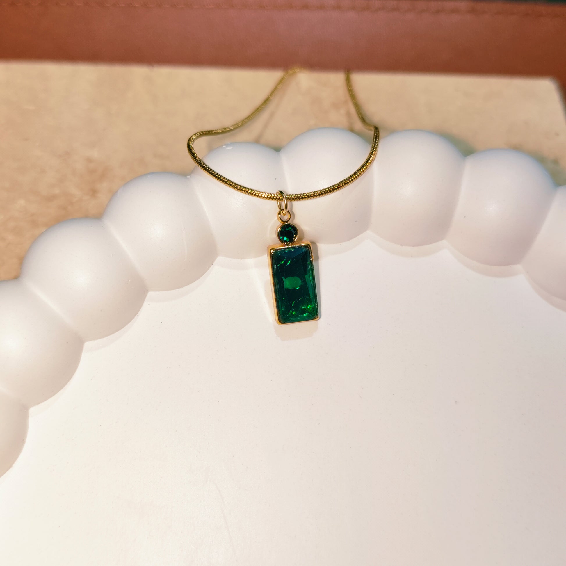 Graceful and luminous, the Aurora Green pendant captures the quiet brilliance of dawn in its rich green hue. Framed in warm 18K gold plating, its rectangular silhouette reflects poise, balance, and timeless allure. A piece that speaks of elegance. Subtle yet impossible to overlook.