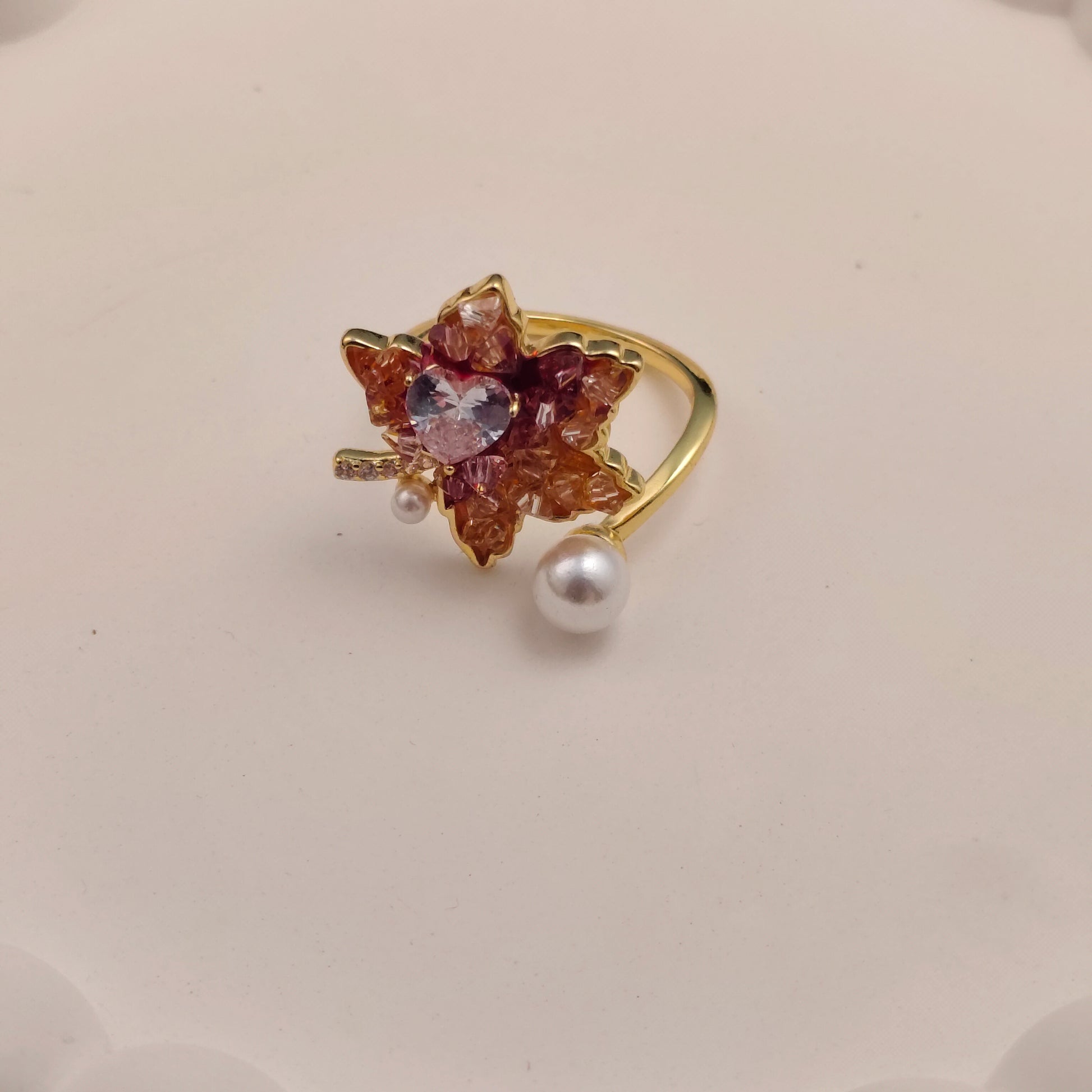 Inspired by the fiery hues of fall, the Autumn Bloom Ring captures the warmth and radiance of the season in every petal. Accented with a luminous imitation pearl at its heart, this adjustable piece brings together grace, glow, and timeless charm. A perfect ode to golden days and effortless elegance.
