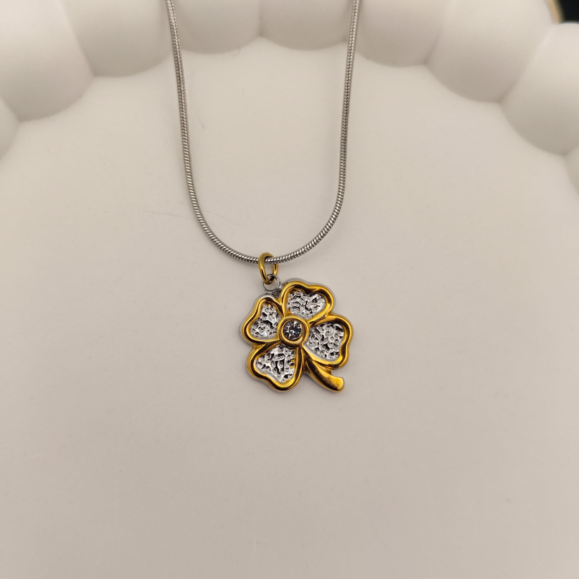 Gracefully merging gold and silver tones, the Dual Bloom Pendant Necklace embodies harmony and timeless beauty. Its floral design symbolizes growth and elegance, making it a perfect piece to complement both modern and classic styles. A delicate reminder that contrast can create the most beautiful balance.
