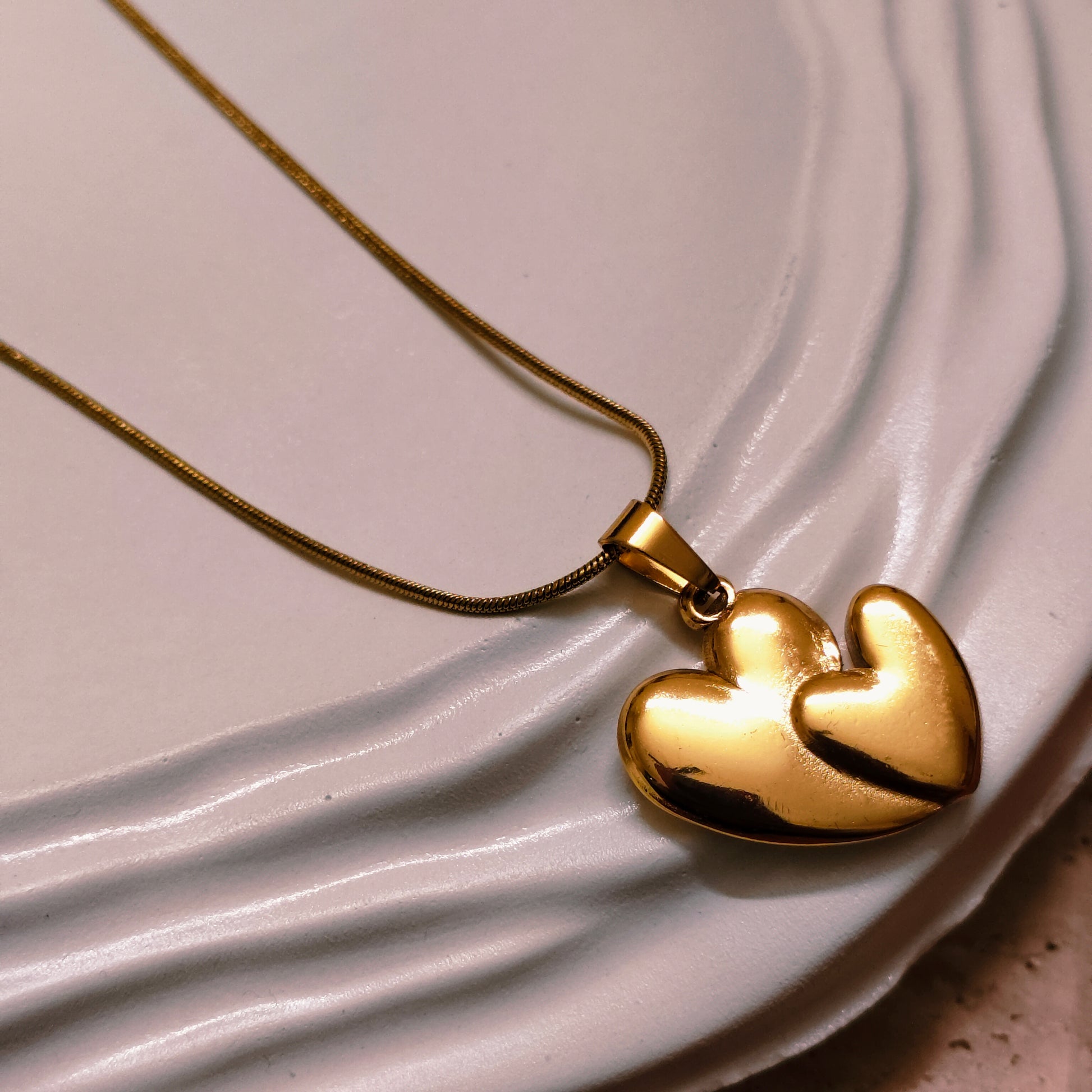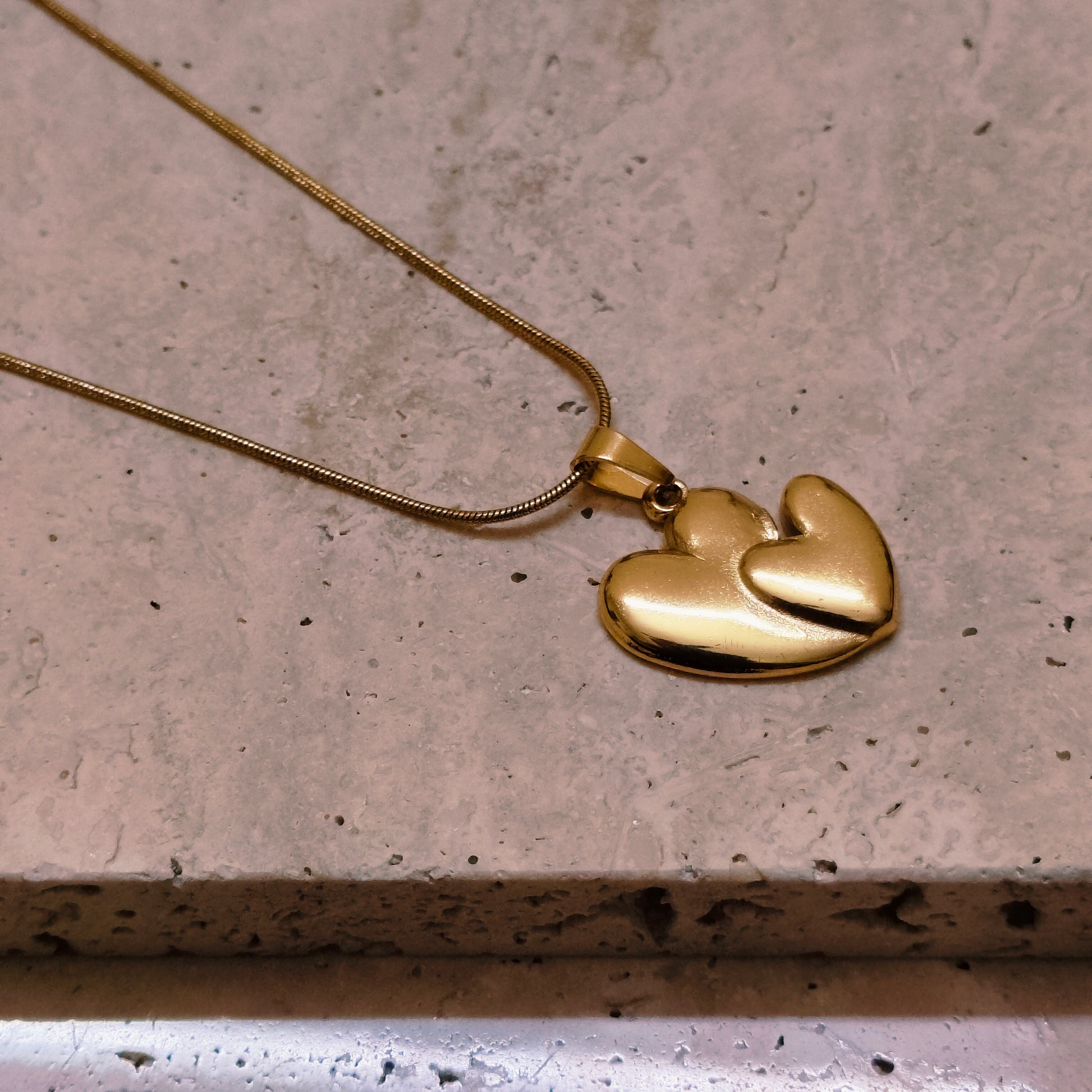 Two hearts, one soul . The Eternal Bond Pendant beautifully captures the essence of connection and love that transcends time. The larger and smaller hearts intertwine in perfect harmony, symbolizing unity, devotion, and balance. Finished in 18K gold plating, it radiates warmth and grace. A timeless keepsake that celebrates love in all its forms.