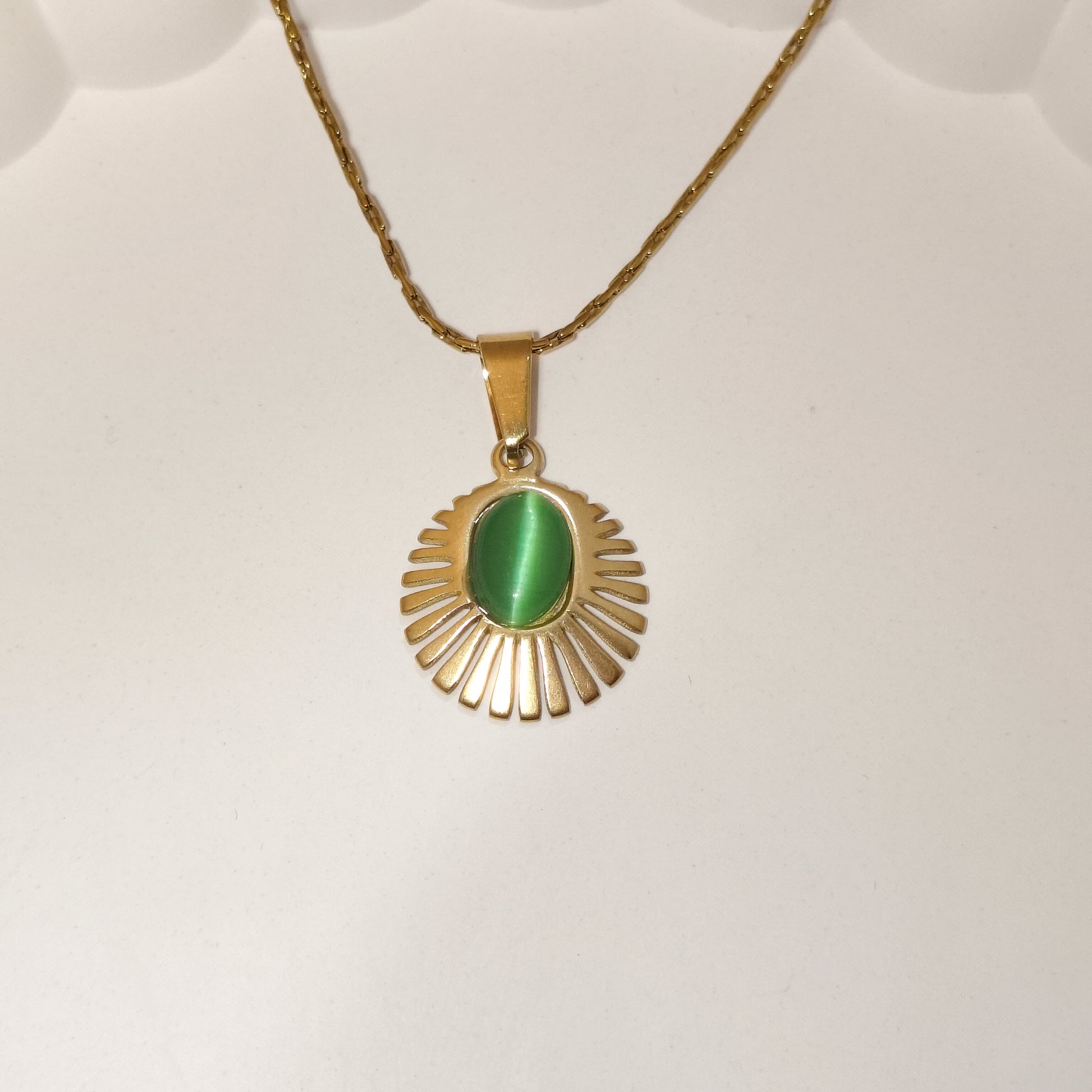 Vibrant and radiant, the Green Ray pendant captures the harmony of sunlight meeting nature. Its luminous green Monalisa stone, framed by golden sunburst detailing, reflects renewal, energy, and effortless grace. A symbol of light, life, and the beauty that shines from within.