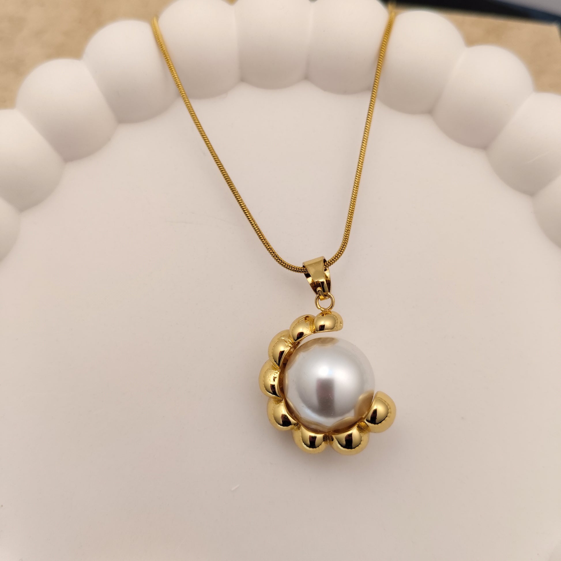 Radiating understated elegance, the Luna Grace 18K Gold Plated Pearl Pendant Necklace captures the charm of a luminous pearl embraced in golden artistry. A perfect blend of sophistication and grace, it’s designed to elevate both everyday and special occasion looks.