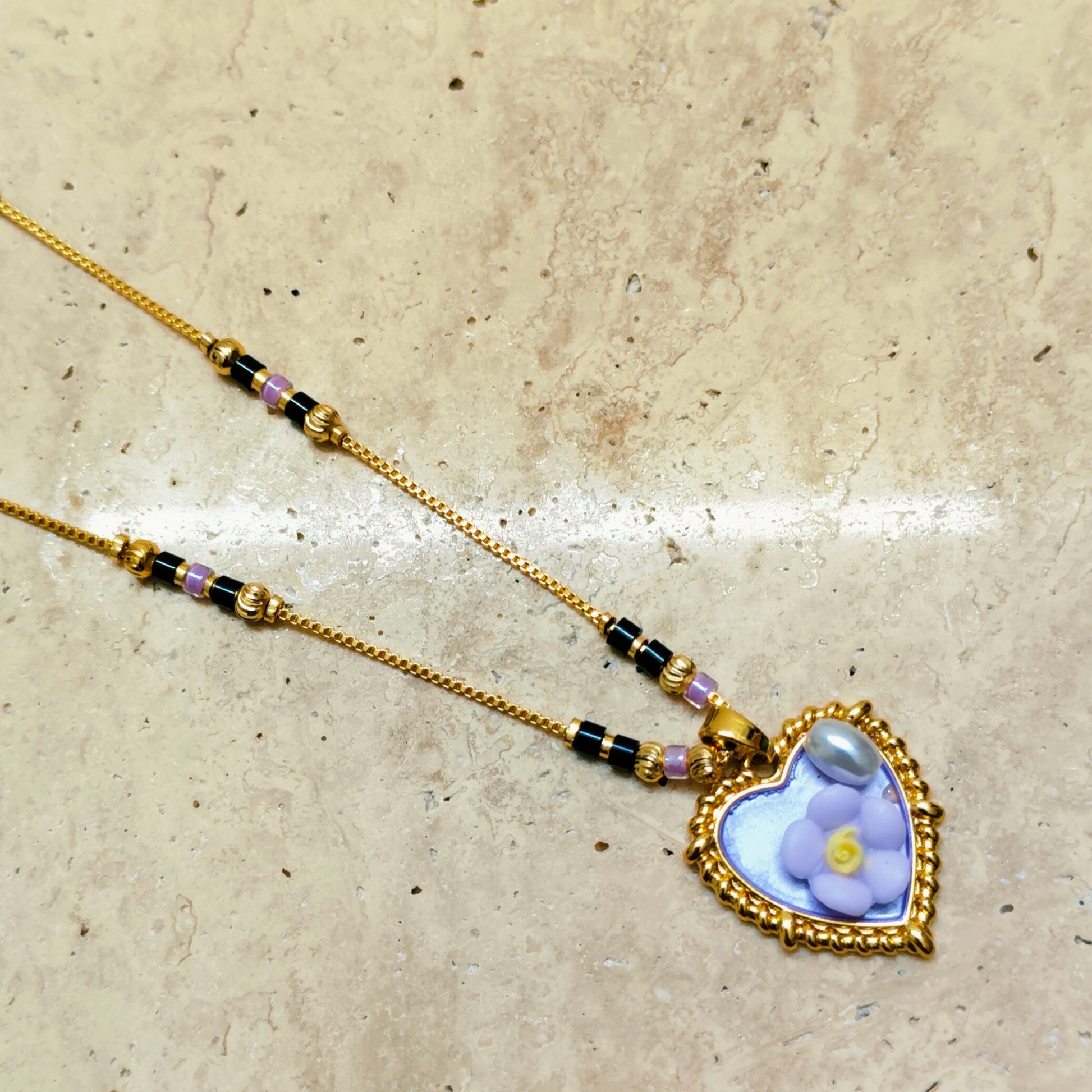 The Violet Bloom Mangalsutra blends modern artistry with heartfelt emotion. A radiant purple heart adorned with a delicate flower and luminous pearl celebrates love’s gentle beauty. Graceful, feminine, and timelessly divine.